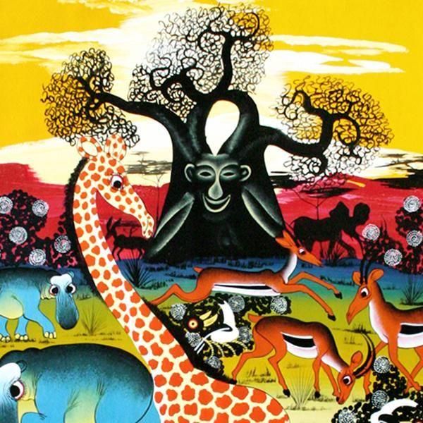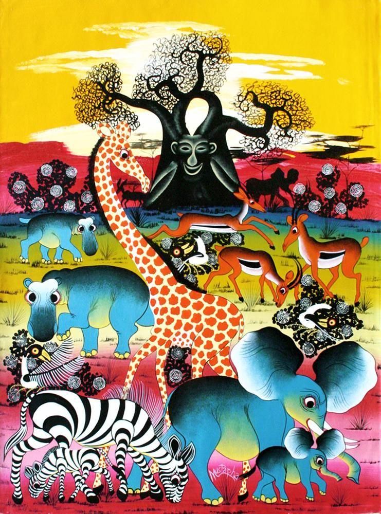 ☆朝焼けに輝く空の下、バオバブの大樹に宿る精霊(シャターニ)が、サバンナの大地に集う動物たちをやさしく見守る、幻想的なムスターファの作品です。