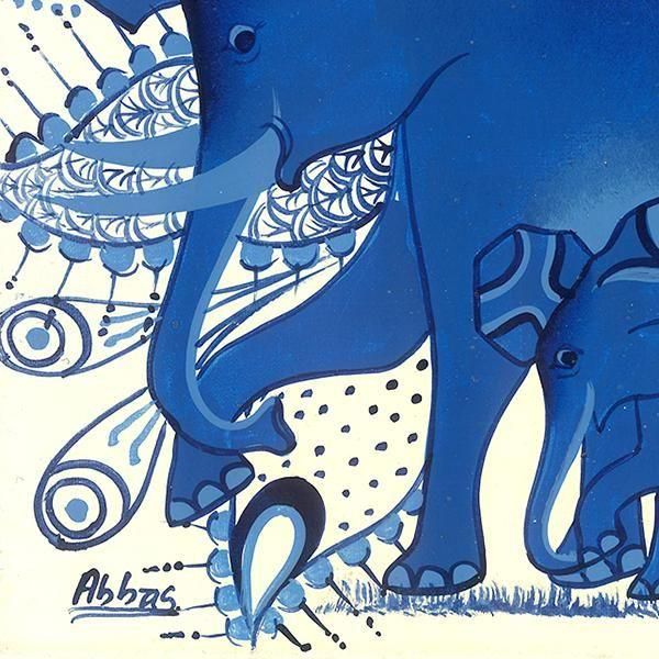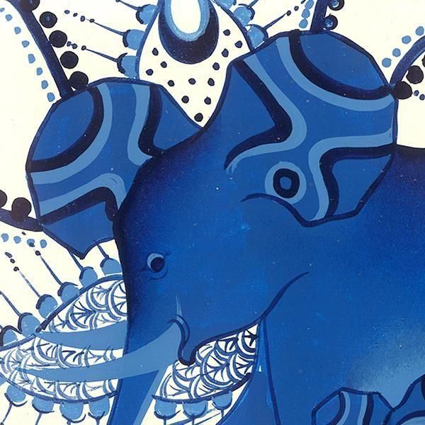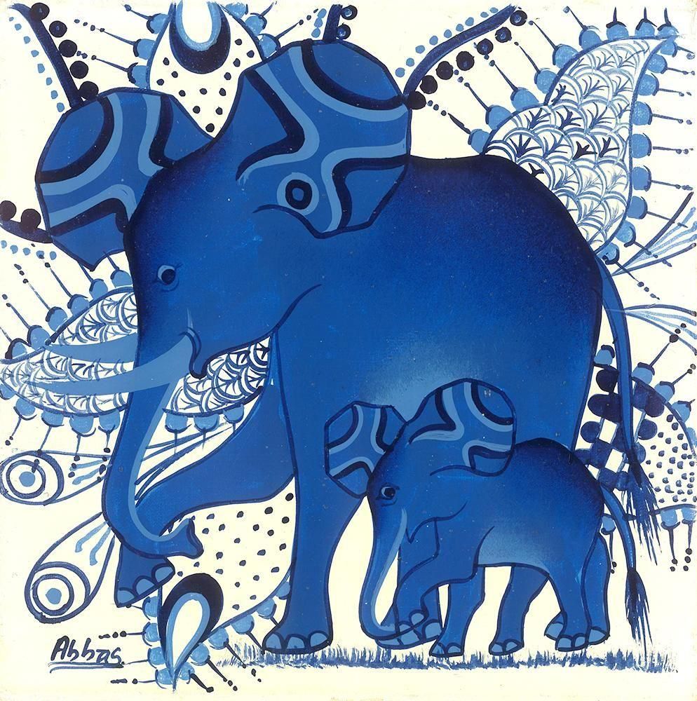 ☆白の背景に、ブルーの濃淡のみで見事に描き上げた、ゾウの親子。背景は細密なペイズリー文様を用いた壁紙デザイン。パステルカラーを得意とするアバスの作品です。