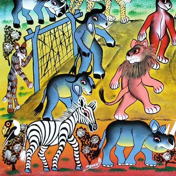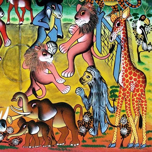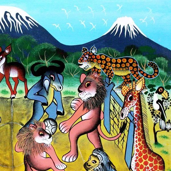 ☆アフリカの鳥獣戯画!サッカーを楽しむ動物たち。一頭一頭の動物が画面から抜け出してくるような動物画が得意なムブカの作品です。