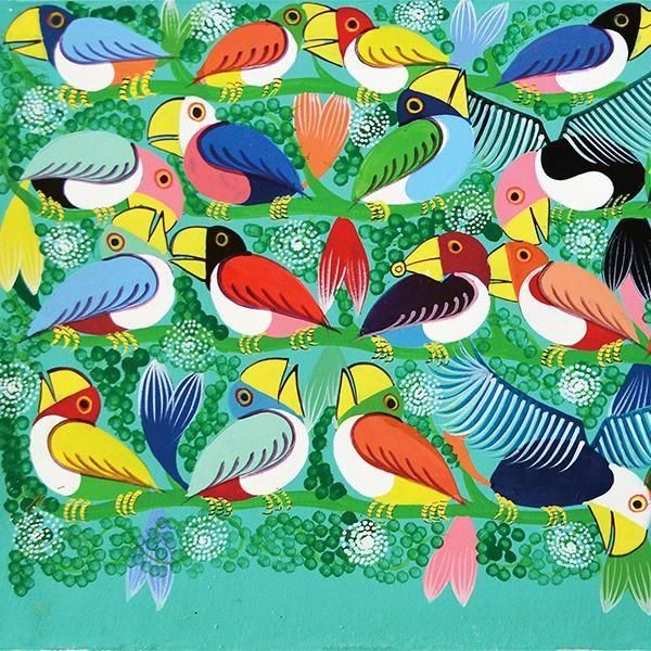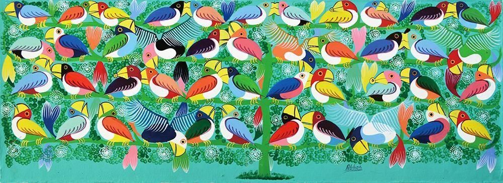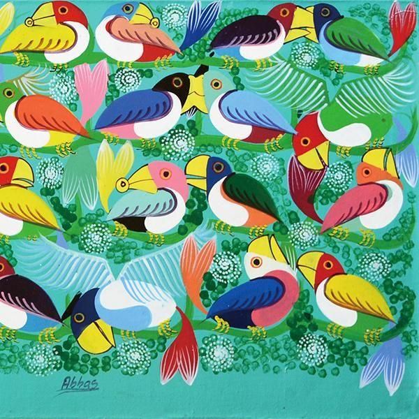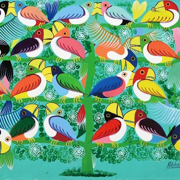 ☆アフリカの大きな木に集うかカラフルな鳥たちのおしゃべりが聞こえてきそう。パステルカラーを得意とするアバスの作品です。