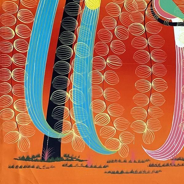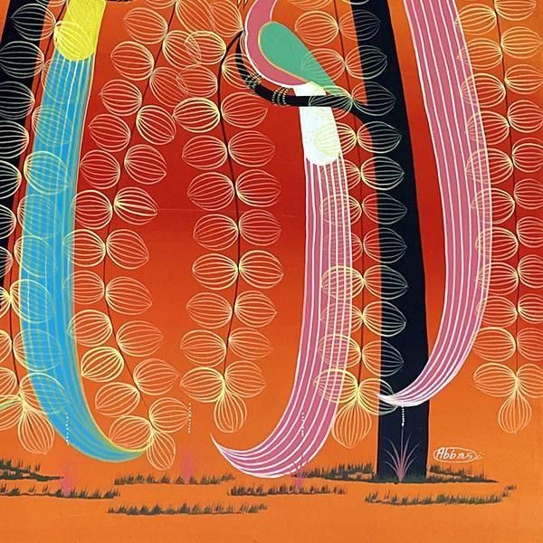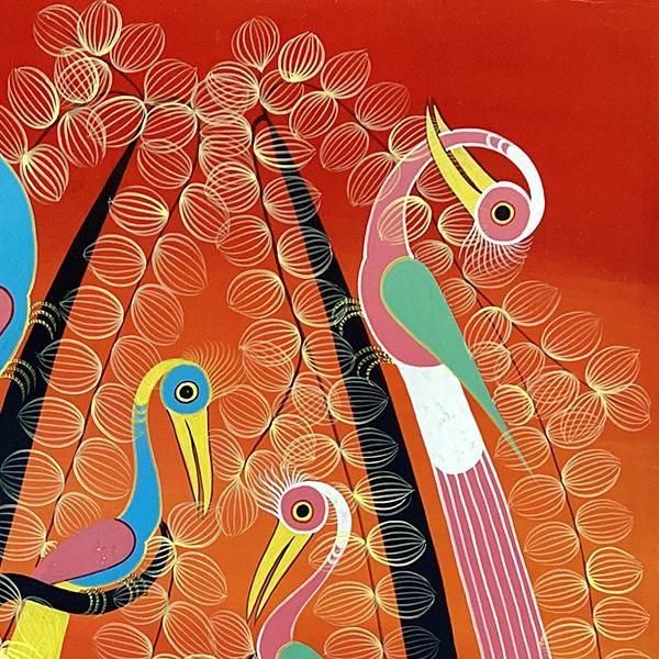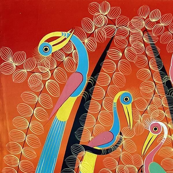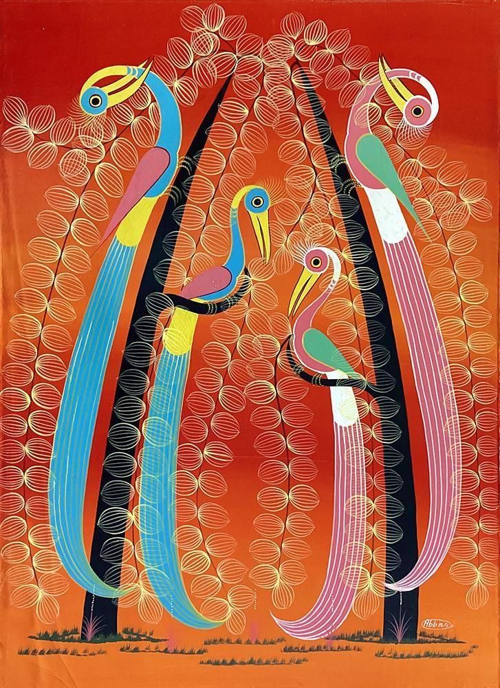 ☆オレンジレインボーの背景に、樹上に集う4羽の尾長鳥。人気のある不朽のモチーフを描いた、パステルカラーを得意とするアバスの作品です。
