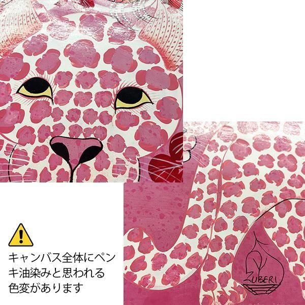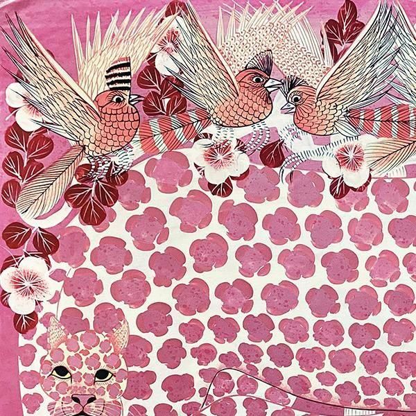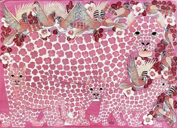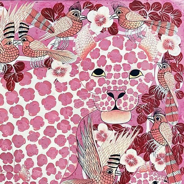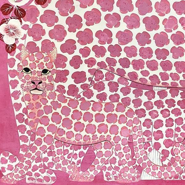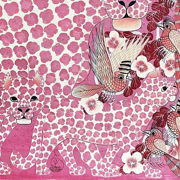 ☆ピンク色で表現された花の樹の下に憩うヒョウの親子。ひとつの色だけで繊細に構成された、ズベリの作品です。