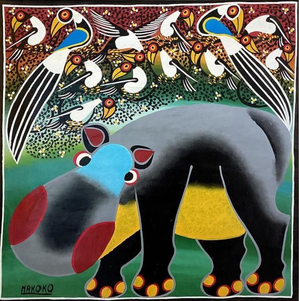 ☆真っ赤なほっぺをした、愛くるしいカバ。花の樹にはオナガドリとムナジロガラスが集います。アモンデの弟ナココのクラシックスタイルの作品です。