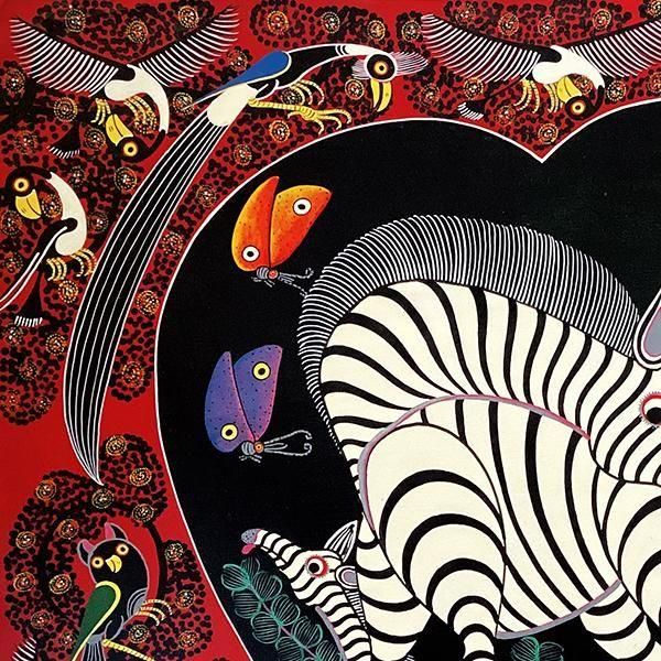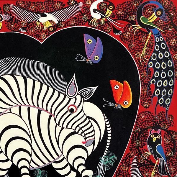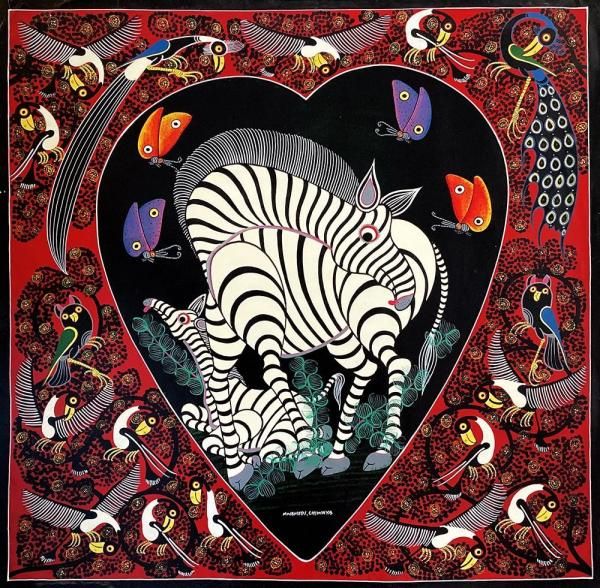 ☆ピンクのハート中には仲睦まじいシマウマの親子、周囲にはムナジロガラスやオナガドリが描かれた、ユニークなデザインの作品です。