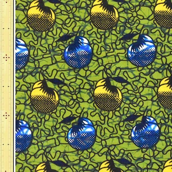▼柄の説明:緑、黒色のろうけつワレ模様地に、黄、青色でアボカドの実と葉っぱが配置された柄のキテンゲ