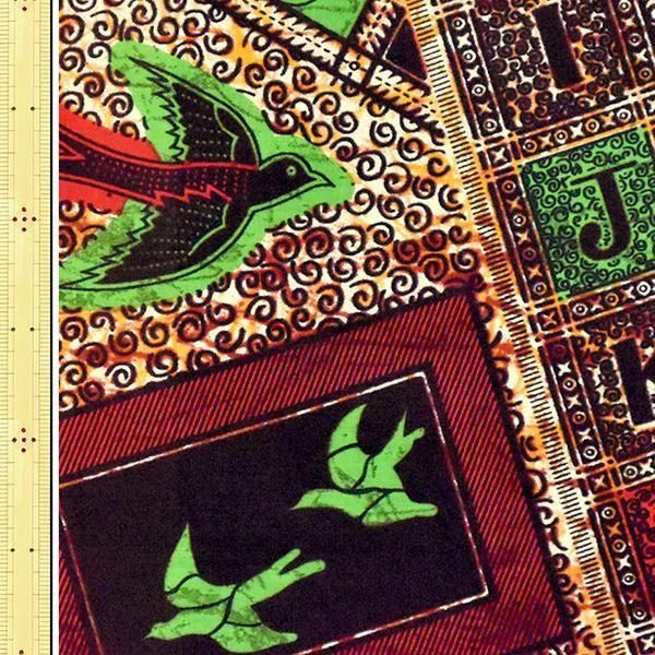 ▼柄の説明:クリーム、茶色のろうけつワレ模様地に、緑、赤色でアルファベットとツバメが描かれたタペストリーが並んだ柄のキテンゲ
