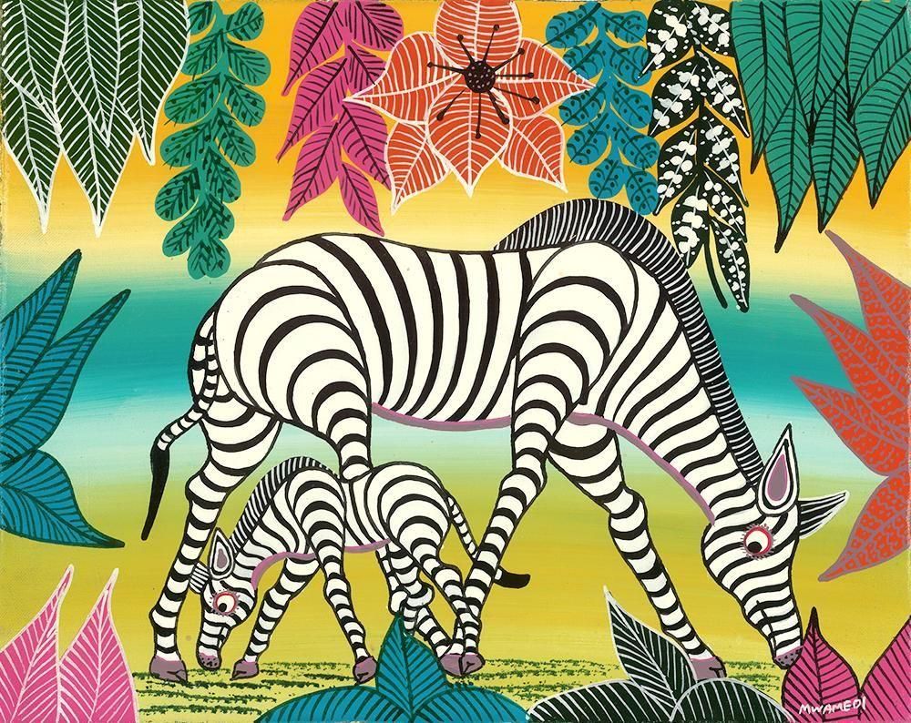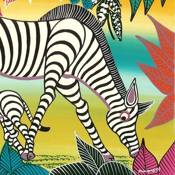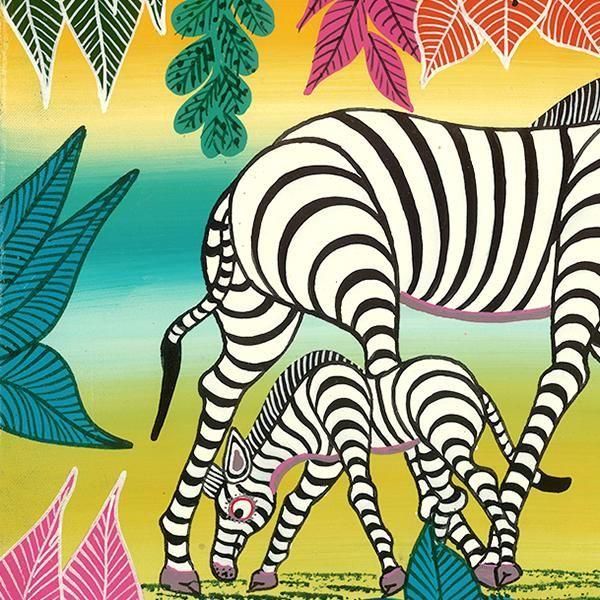 ☆シマウマの親子が熱帯の植物の下で仲良く戯れています。レインボーの背景に鮮やかに描かれている、ムワメディの作品です。
