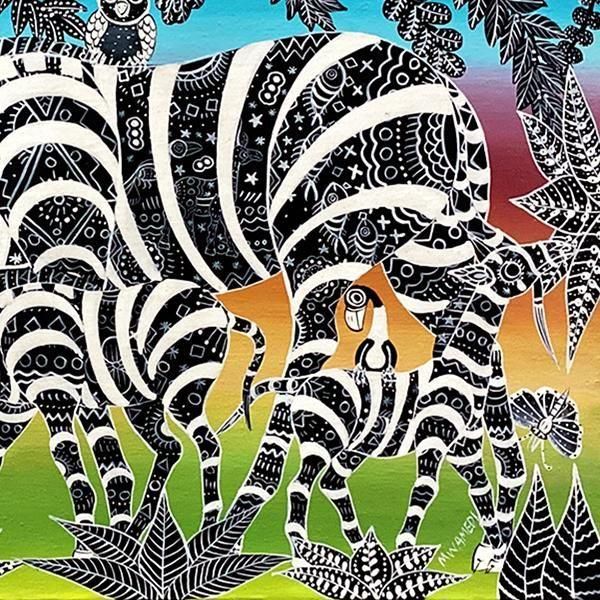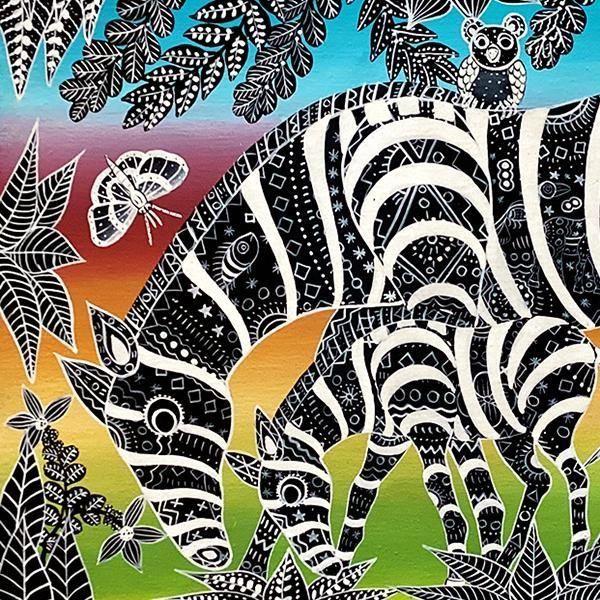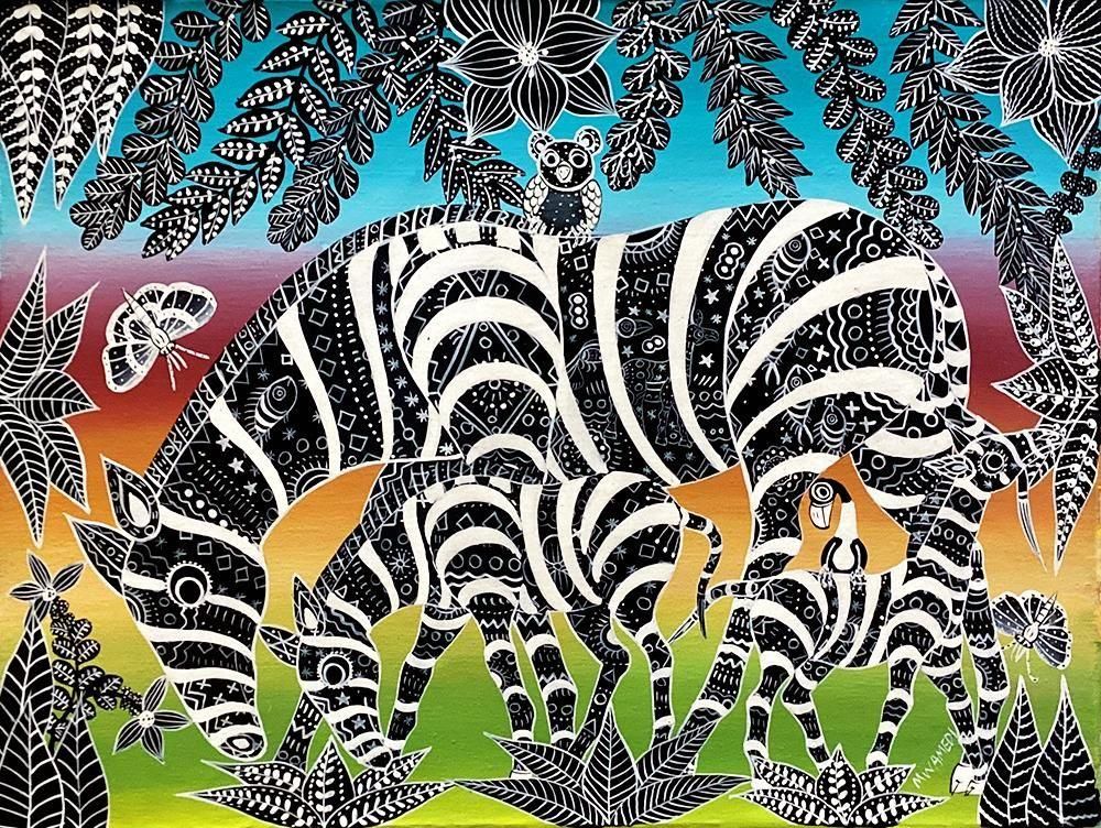 ☆モノトーンで表現された美しい模様のシマウマの家族が、熱帯の植物の下で仲良く戯れています。レインボーの背景に繊細に描かれた、ムワメディの作品です。