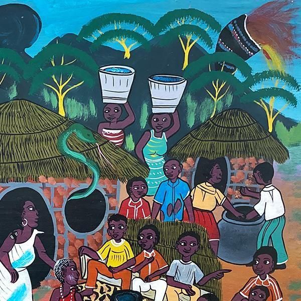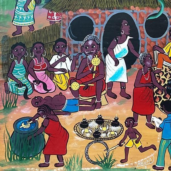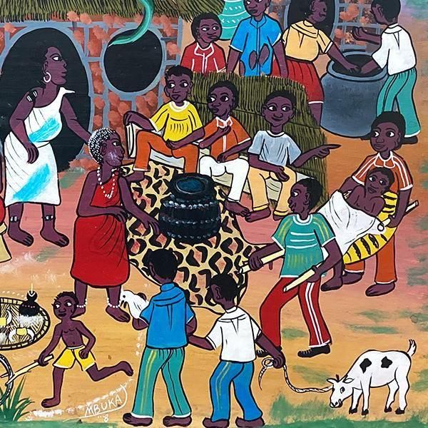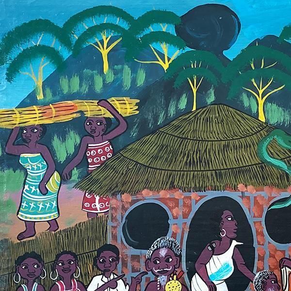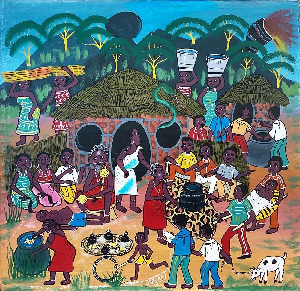 ☆人々の病を癒す、アフリカのムガンガ〜呪医。儀式に使う道具を手にする姿が色鮮やかに描かれています。村の日常風景を、画面から抜け出してくるような躍動感を得意とするムブカの作品です。