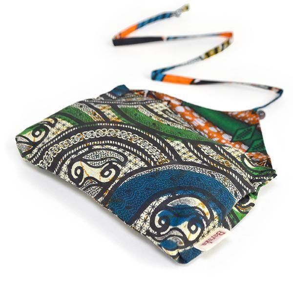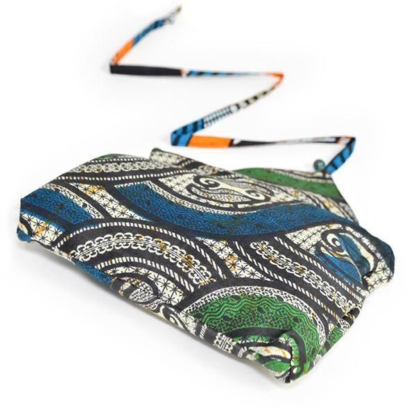 ☆カラフルなアフリカ布キテンゲで仕立てたヒモ巻きポーチ。入れる物を選ばず、自由な大きさで紐を巻くだけ。大小 2サイズ展開。
