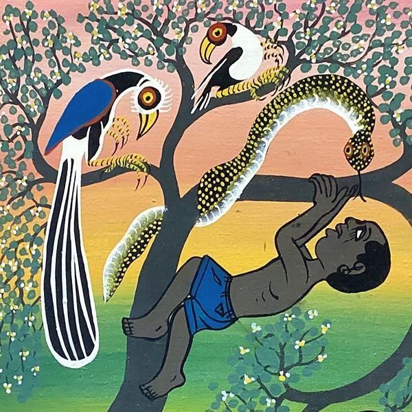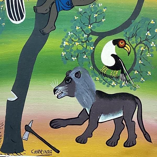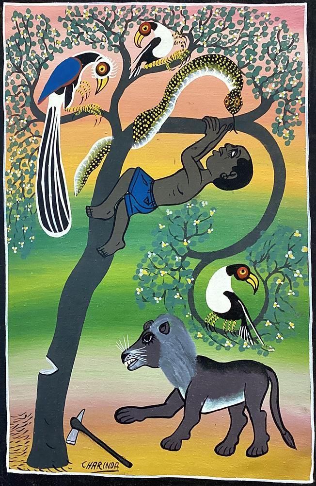 ☆ライオンと、蛇、オナガドリ、木に登る少年が存在感あるタッチで描かれた古参アーティストチャリンダの作品です。