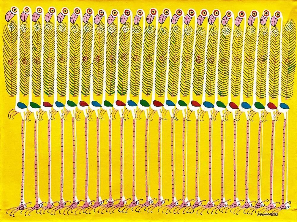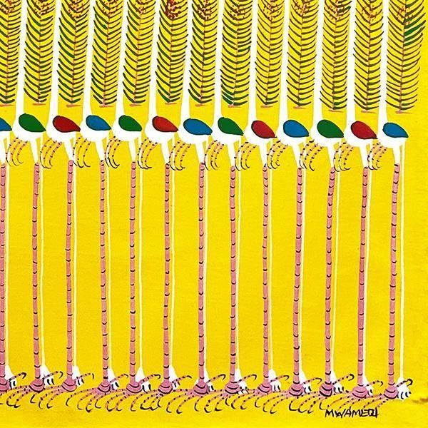 ☆イエローの背景に、整然とダンスをするフラミンゴたち。人気のある不朽のモチーフを描いた、美しいムワメディの作品です。