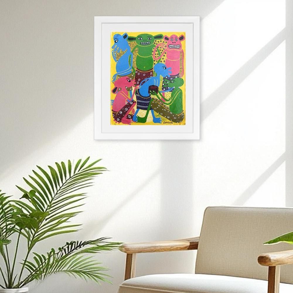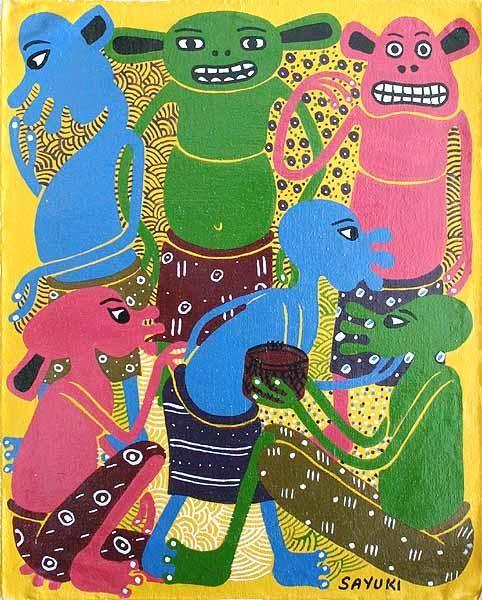 ☆ほのぼのと村の男たちが酒を呑みかわす姿が優しい雰囲気。シャターニ(悪魔、精霊)たちがキュートに描かれたサユキの作品です。